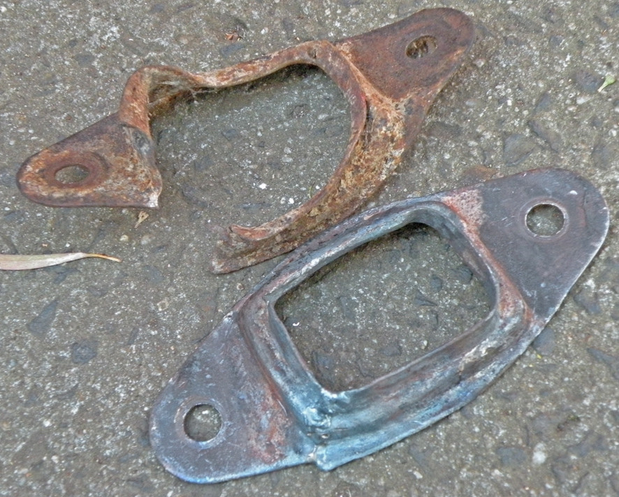 My good friends at Blast Off picked up the chassis frame this afternoon and while not wanting to start into anything major at 3.30 on a Friday afternoon I though I would make a start in straightening out the tinware for the rear "bump-stops". The front ones were OK as they mount onto the top of the spring and are anchored by the 'u' bolts. I think that I mentioned that the rear ones had suffered from a little gentle battering.