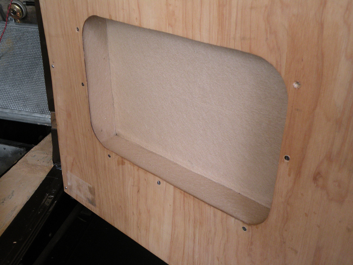 While I am waiting for the next lot of painted panels to be finished (perhaps tomorrow). I am doing another one of those little jobs for which there does not seem to be the "right time". I am doing the felt interior for the door pockets. Not particularly exciting but just another something that has to be done "sometime". Prior to starting this I put some wood filler into the timber alongside the aluminium toe board. Hopefully it will finish up smooth enough for me to use some of the off-cuts of linoleum, from the floor boards and running boards as, I believe, would have been originally done.