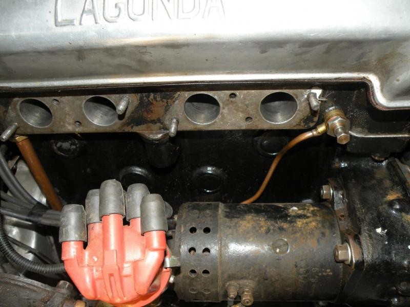 The oil drain tube is the copper tube just visible in the bottom left hand corner of the photograph. The fitting I needed to tighten is the one hidden behind the distributor cap/plug leads. Next to this you can just see the steering box. The distributor is driven from the rear of the generator. The generator is gear driven from one side of the timing gears. The other oil pipe you can see is to bring oil at full pressure to the cam bearings. It has a metering screw to regulate the pressure, the cam bearings do not require the same amount of pressure or volume of oil. Those are the four inlet ports you can see, the four exhaust ports are on the other side of the cylinder head.
