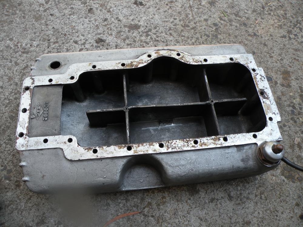 This of course is the drain valve, yes a real valve, that when the handle is turned toward the front the valve is lifted allowing the used oil to drain out. Being built to suit the requirements of a "Better class of owner" , this could be done without the need to clamber under the car. When the last of the oil has drained you simply move the handle towards the rear and the valve is closed. You can then add the new oil. The underside of the sump has a generous number of "fins"to assist with cooling and to add strength to what otherwise would be a rather large flat slab of aluminium.