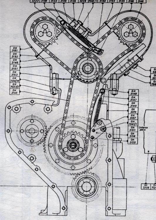 With the Rapier engine all back together and running I was concerned about a little noise that I have tracked down to the water pump ( I think) like all the things on a Rapier engine rather than having crude rubber belts and pulleys to drive them, the water pump is driven directly off the front of the gear that in turn drives the dynamo (generator ) and then the distributor which is driven by another pair of gears at the rear of the dynamo. The water pump drive is a straight forward dog engagement. I now have the water pump dismantled and having inspected it can see no possible source of this noise but I will repack the two (one ball and the other roller) bearings with high temperature grease replace the "O" ring and cut a new gasket for the joint where it bolts onto the timing case. While I am doing this I will put a light smear of grease onto the dog coupling. Hopefully when I restart the engine the noise will have gone away, and the pump will not start to leak. To date it has been completely free from leaks ever since I last put it together almost 40 years ago. The ceramic/rubber seal looks as good as it did when new. I only hope that it does not mind being disturbed. Taking the water pump off requires the radiator and bonnet (hood) to be removed. The two photographs show the front of the engine showing the oil pump which is driven from the front of the "triple sprocket" which carries the timing chains to the camshafts. It has the inlet pipe bringing oil from the sump disconnected to make access to the four nuts that retain the water pump. The second photograph is looking in through the timing case to reveal the water pump drive "dog". The round cover plate gives access to the oil pressure releif valve while the diamond shaped plate gives access to the tensioner for the botton timing chain. The drawing shows the entire timing gear/chain arrangement. Rather that one long chain "flapping around" the three gears and three chains keep everything nice and compact. The sprockets on the front of each camshaft have a vernirer adjustment to allow very precise valve timing, With every thing well thought out and precise makes working one the engine a real pleasure. My admiration for the Rapier's designer the late Tim Ashcroft never ceases.