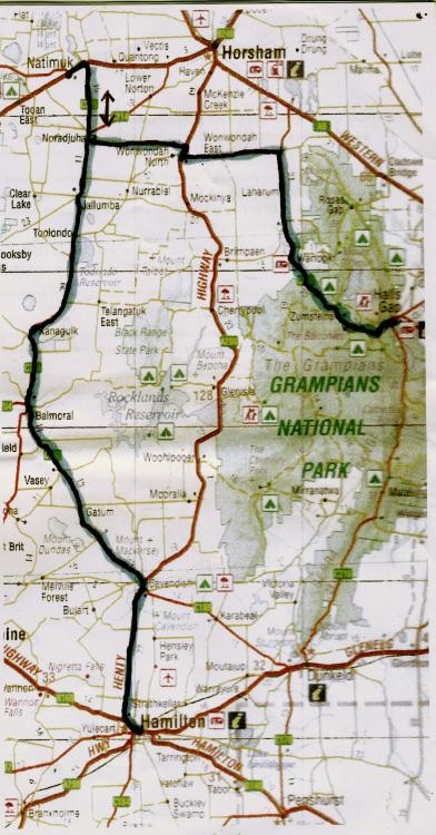 Lunch over we were off again returning to Noradjuha from there we followed the C214 for just one mile then turned onto the only section of gravel road for the whole journey and after only 3 and a bit miles joined the Henty Highway. Our instructions informed us that we could recognise this as It had a “white line” painted along its centre but not for long! The next turn took us onto the Wonwondah-Laharum Road followed by another turn on to the C222, the Northern Grampians Road. At Laharum the C222 was signposted to Halls Gap via Wartook and Zumsteins. Here we were cautioned that the route was unsuitable for cars towing caravans as it twisted and turned along a winding road, not a problem for the Rapier although it was along here that after one or two too many pot-holes the exhaust silencer decided to part company with engine pipe. Having straightened out one or two of the flexible supports and suitably put it back in its place with a few sharp blows with the wheel hammer we could continue on to the finish at Hall’s Gap. We had to also make an adjustment to the charging circuit after some miles with the amp meter failing to register either a charge or a discharge. Following this we continued with the side and tail lamps turned on to avoid over charging the battery. The afternoon’s motoring added another 60+ miles to the total.