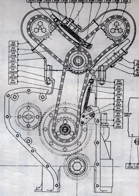 I hope that this is of some help. Being a four cylinder engine the timing gears are 2:1.. There are three chains one from the front of the "half-time" gear goes to a triple sprocket at the front of the cylinder head with two seperate chains going one to each camshaft. The three chains are all kept in tension by "Weller (spring) blade tensioners. The engine will "rev" happily to 6,000 rpm.