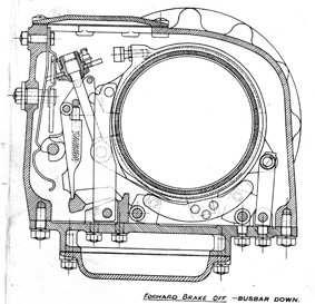 Sorry that was not a good choice of drawing as Top gear is in fact a cone clutch. The drawings below show the engagement of one of the intermediate gears which rely on the brake bands for engagement. The problem I had seems to be that the busbar failed to pick up a strut and with no resistance went to an over centre situation so that depressing the change pedal (Clutch) failed to compress the spring and the busbar remained in the up position.
