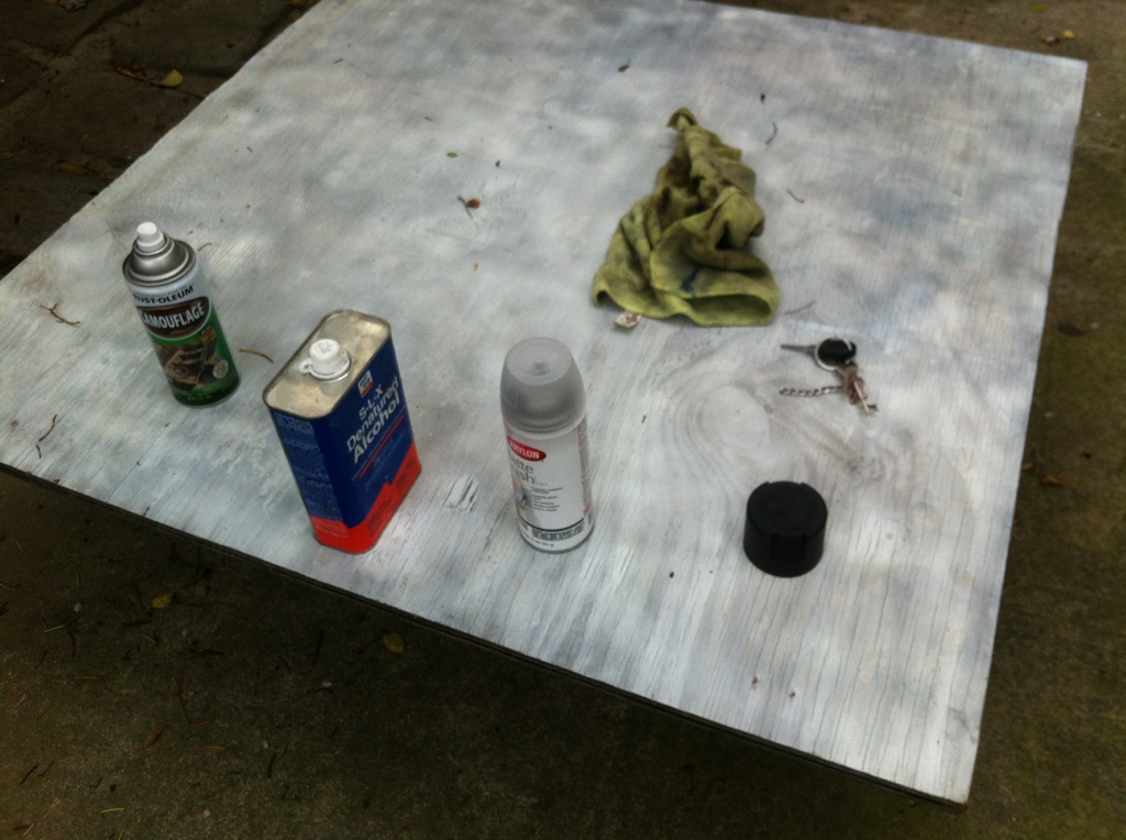 I ended up using Rustoleum's heavy duty multi-surface Primer+Paint Camouflage paint and Krylon's outdoor Satin finish clear coat. Both these are rated to dry in 2 minutes or less