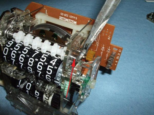 Ok, seriously. Look on the left side of the assembly and you will see a plastic plate with a round thing under it, that is the electric motor that turns your odo gears. There are three screws that hold the plastic piece and metal support on the assembly. Remove these screws (circled in picture). DO NOT ATTEMPT TO PULL THE METAL OFF OF THE ASSEMBLY! DO NOT ATTEMPT TO REMOVE THE COMPONENT BOARD! The left screw for the motor is in a tight location just be careful and take your time with a small screwdriver. Once the screws are out remove the cover for the motor. NOTE: the beveled edge goes up during reinstallation.