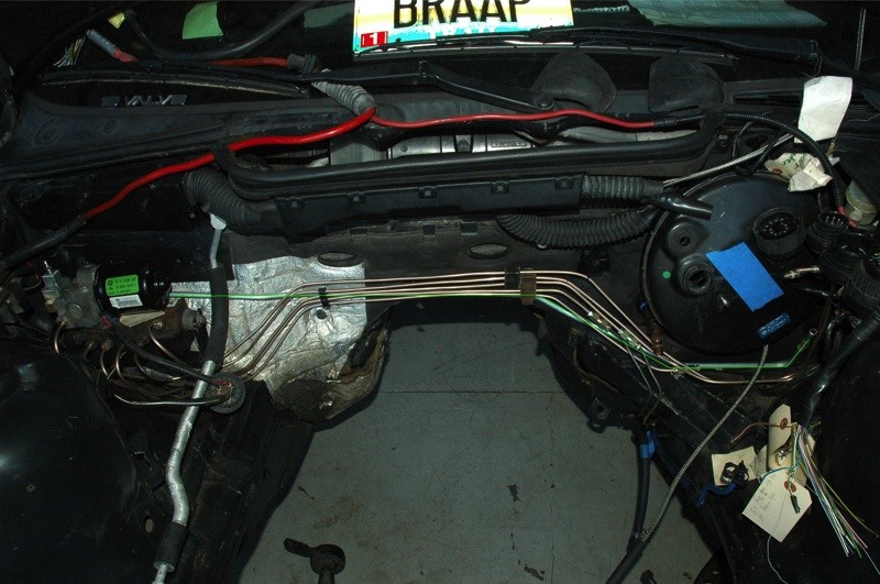 Engine is still sitting beside the car though I did get the low pressure brake line from the reservoir to the ABS module finished and connected. Ran a 3/8” hard line across the firewall with continual slope so any air in this large of line will naturally float up to the master cylinder reservoir or the bleeder block I fabbed and attached tot he ABS module. This bleeder block has two fittings that spaced out perfectly and directly plugs into the ABS module replacing those black plastic fittings. The Bleeder block is hollowed out with an open cavity at the top with a bleeder screw to seal it. Line out the bottom is 10mm with a small section of the 10mm BMW brake hose joining to the 3/8” line and the bleeder block.