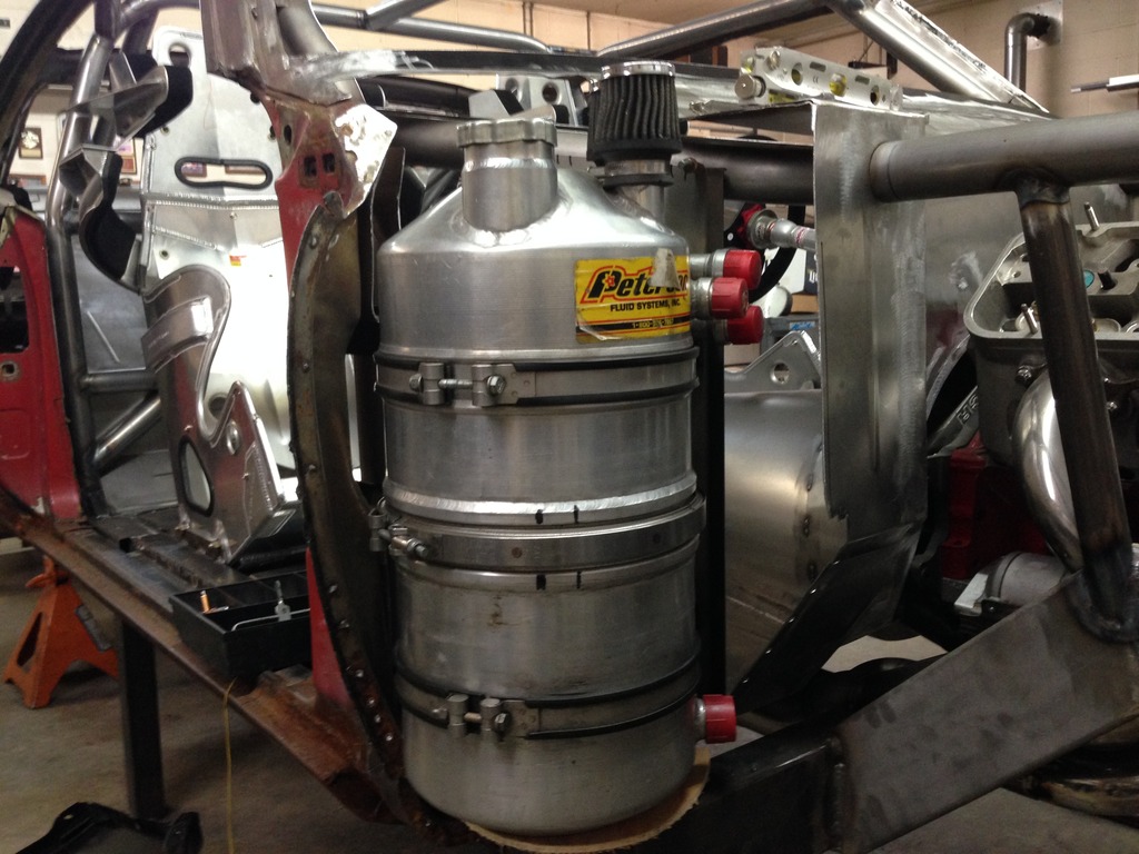 Stopped by to see the car today and the oil tank install is complete. We modified an existing tank by changing from 3 inlets to one 16 AN and changing the outlet to 16 AN. 3 breathers to 1 that will have 22 AN and will run to a catch can/ breather combo. Moved the drain to clear the frame and be able to drain the tank without making a mess.