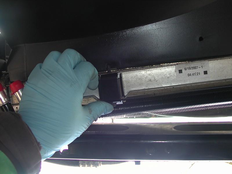 Before you start to remove the cooler, make it easier by removing the plastic panel that mounts under the rad. You can easily just pull on the plastic rivets to remove them.
