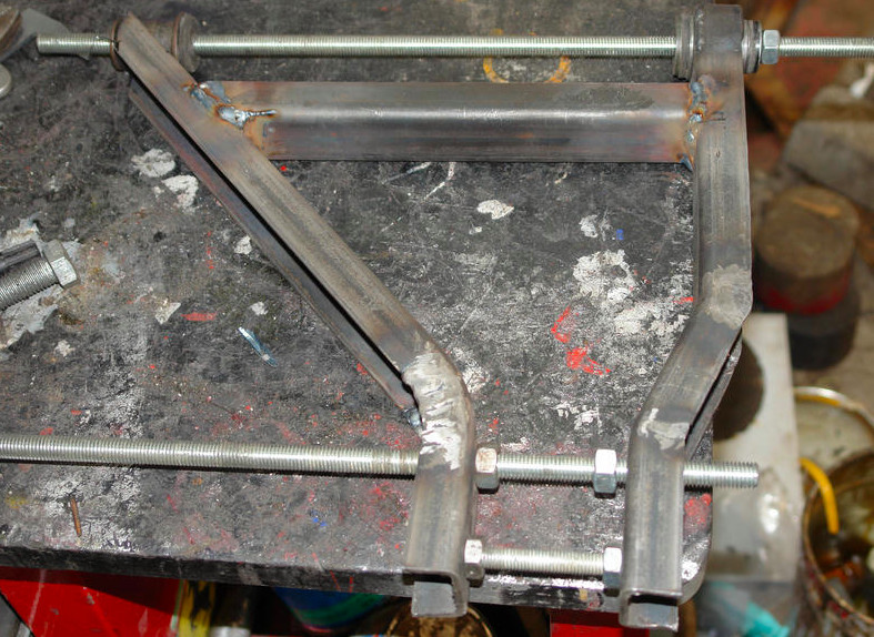I had started building new A-arms but these were intended to be used with the upper shock mount extender that I later rejected. Also I didn't like the welded angles in the upper A-arm, the welds might break after a while of alternating loads (metal fatigue) so I didn't use these, only for measuring puposes.