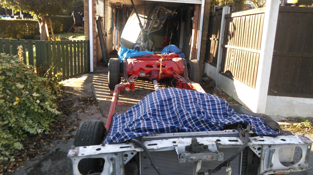Here's a view of the chassis outside my home garage and the body tilted for rocker panel redesign.