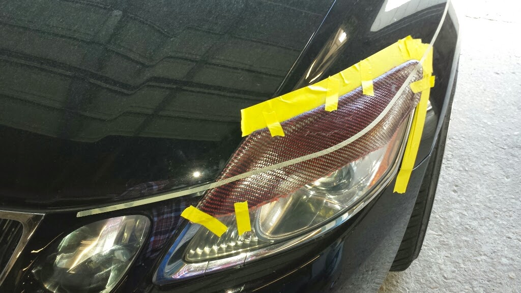 So that created the form to build from. Next I had to shape it. Trimmed off the excess and taped it up to the headlights to decide on the shape. I used some vinyl tape to help me draw the lines from the factory body line on the fender to the hood. This is what I came up with.