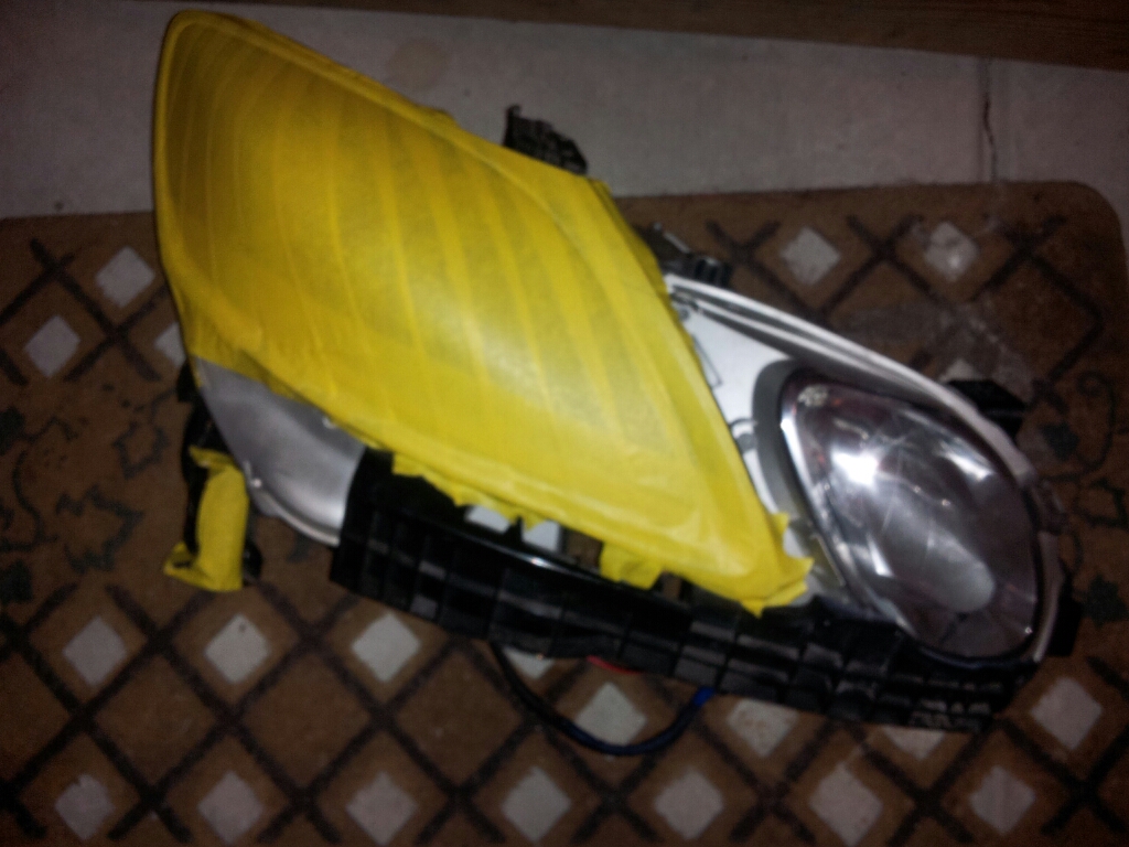 With the headlight out I also wanted to make some eyelids. I couldn't find any eyelids for sale at this time and well hey how hard could it be to make right. lol.. it's a pain!!! Well first step was to mask off the headlight to create a mold per say. I used some silicon spray lube so the resin would not adhere to the tape.