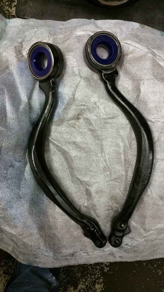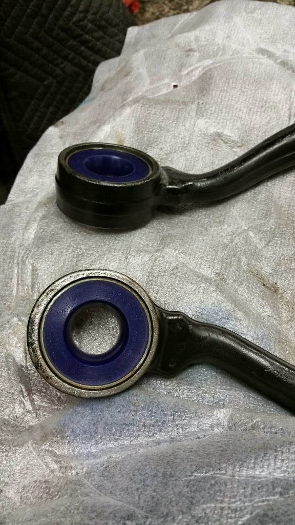 I don't get to work on my car on a daily basis so to move things along quicker I got a used set of arms to press out the old bushings and press in the new bushings. Fold in the lip on one side press out the old bushing and press in the Fig's bushing. The pic shows only the press in bushing installed, the metal sleeve has to be greased and put in along with the end caps. I waited till the day of install to grease it and assemble it all together. The metal sleeve can be hand pressed in so no big deal but the grease is really sticky so didn't want it being exposed to other elements.