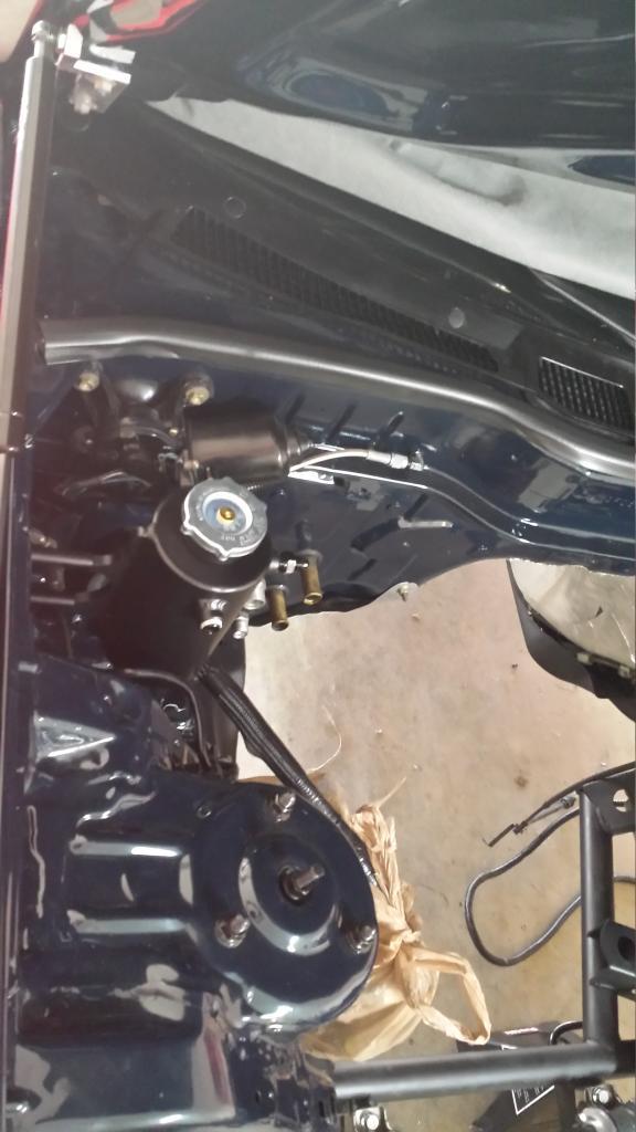 I chose a vertical surge tank and mounted it where my WI tank was. Samberg uses the horizontal tank in his kit, which works great. But for me, it was visually not what I wanted to achieve. Overflow line routed through the fender.