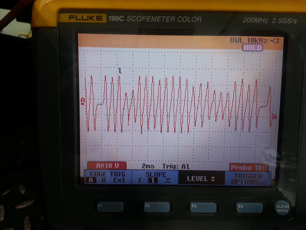 This is a pic of a scope hooked up to the crank sensor. I appear to be having a slight signal issue. This is delaying the tuning. I have a new stator assembly on order. The crank sensor is part of the stator assembly...