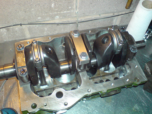 Based on a south african 70mm crank, 73.5mm floating forged pistons, 'h' section rods, new head from southam mini an metro centre, split webers, bp300 cam.. erm.. i think all the rest is the same as the old 1071, gearbox and flywheel-wise. It made 90bhp at the wheels on southams rollers.