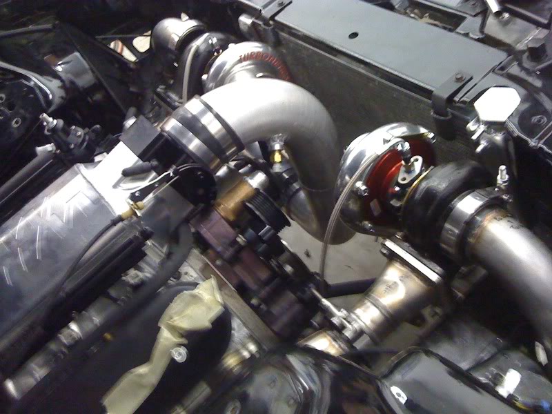 Next order of business is a cold air intake contraption. Due to the orientation of the turbo's, he is picking up air that is 150* degrees to start with from behind the radiator. The other problem is that they are only 4" from the charge pipe which mkaes for a very tight radius. Too tight for a 4" 90* to go on there.