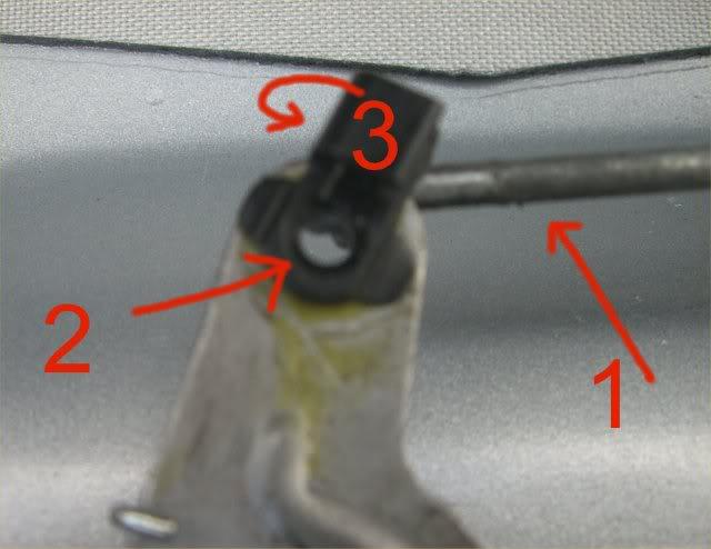 Number 3 points to a GAP in the rod holder the rod is marked 1 - slip the rod out of the GAP marked three. Once you have the rod out of the rod holder, leave the rod holders in place. You will be able to remove them once you have the factory handle removed by simply squeezing them from the bottom. If you try to force them out while the handle is still installed you will break them.
