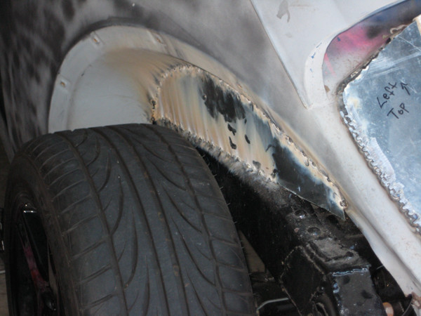 Having a couple gallons (everything is sealed...but) of gas in the tank and the fact the paint kept catching fire on the bug body when I was welding the wheel well pieces up kept me from wanting to fully weld these things up. Some MasterSeries and sealer will finish the job here.