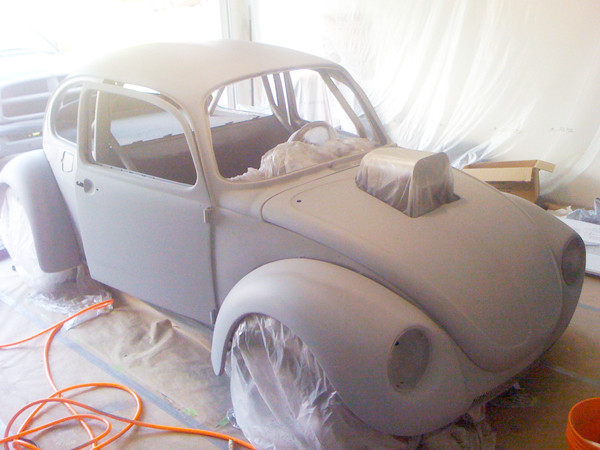 As you can see I put down a skim coat on the entire hood. Im noticing where I was having my problems the filler was sanded flat. It didn't have that nice curve the vw roof has.