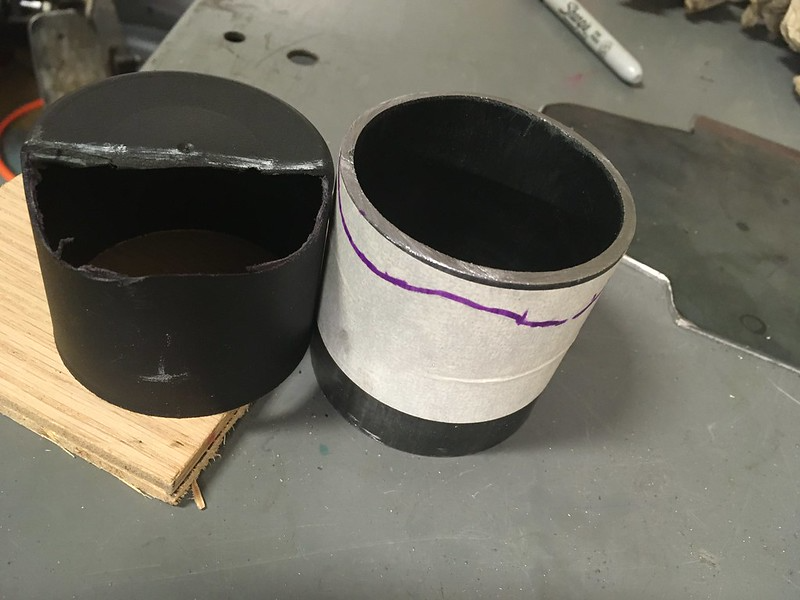 The EPS fits in a cup welded to the bumper bar so we needed to mock that up. Fortunately, we discovered that most paint can lids are the right size so a can of Rustoleum Self Etching Primer donated its lid. This intersects with the bumper bar about half way so we had to shape it carefully with a file.