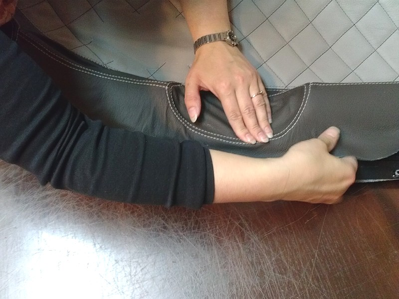 So now - apply the glue to the area described above, allow it to dry a bit (2 minutes is more than enough) and lay the leather cover onto armrest area first.