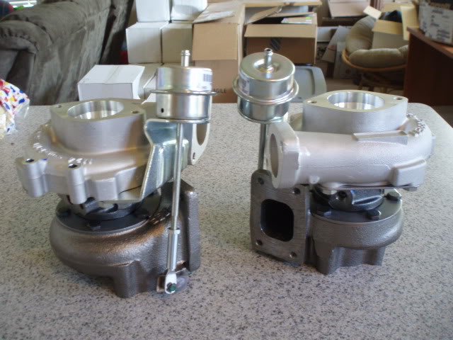 Anywho, here's some pics of the new turbos (unmodified) and wastegates. Can you guess what turbos these are?