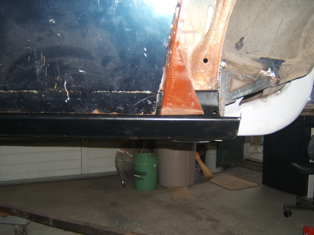 Didnt get as much done today as I wanted to but I got to remember........"a little at a time". 6 hrs and 48 spot welds latter I finally got the door jam brace off the donor quarter panel. Got the brace and rocker on with screws for now. Looks realy realy close so far. Will start taking off the wheelhouse and trunk drop off off the quarter tomorrow. Time to relax, have a few beers and look things over. After a days work I always have a beer and look the car over to see if I missed anything or whatever.