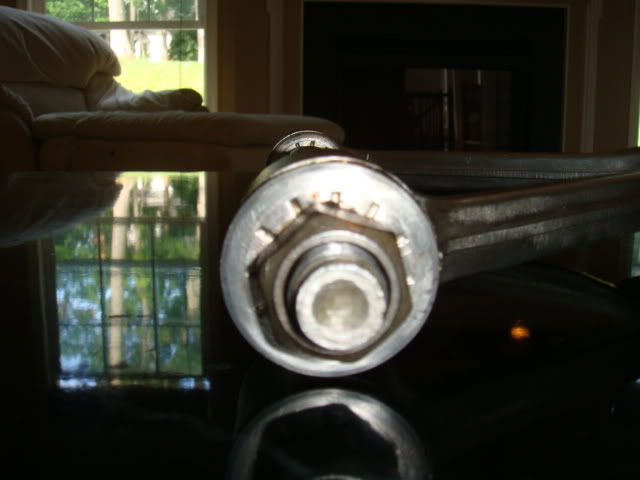 The upper A-arm ball joints were well constructed by TRW as well. The holes were slightly elongated in order to facilitate proper alignment during installation. I used red loctite and the new ES urethane boots on these. The tricky part with the upper A-arms is the installation of the new bushings. In the instructions it tells the installer to use a brace to keep the arm from flexing during the bushing installation. We used a 3/8th socket extension and a small metric socket in order to get the proper length and it worked like a champ. The installation of these bushings were the most difficult, because of the finessing required in order to have all the right bushings just in the proper location and to get all the planets and stars lined up in order to get the bearing press event to go smoothly. Either way, here's the setup with the support rod.