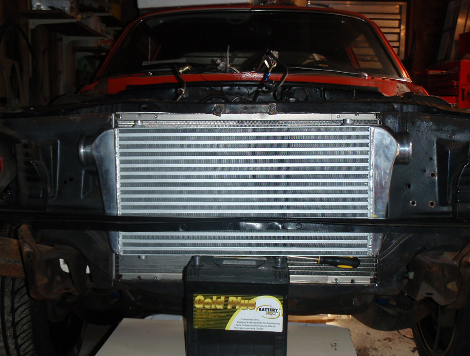 I originally thought that this would be the best way to mount the intercooler, so there'd be ample tubing clearance underneath/behind the bumper...