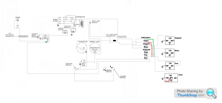 This is the original loom plus the relays I had added, I had coloured this in on paint and then broke the loom down to it's systems; engine, lighting accessories etc