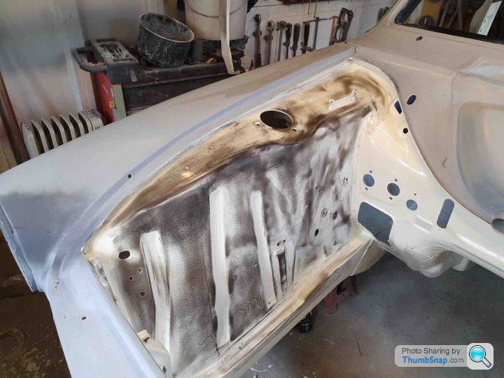 This leads me into the next steps with the Cortina; with the inner wing paint needing repairs I flattened the paint, masked it off and the rest of the shell and figured whilst I was mixing paint I'll might as well do the rest of the shell.