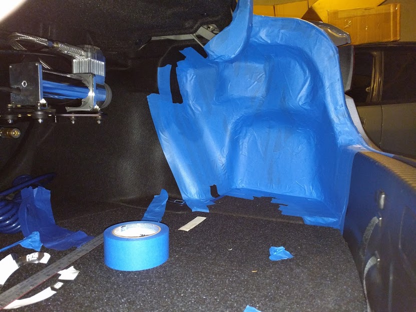 used a cardboard template to figure out the bottom of the subwoofer enclosure. Cardboard easier to cut and do over if I mess up rather that do it on wood