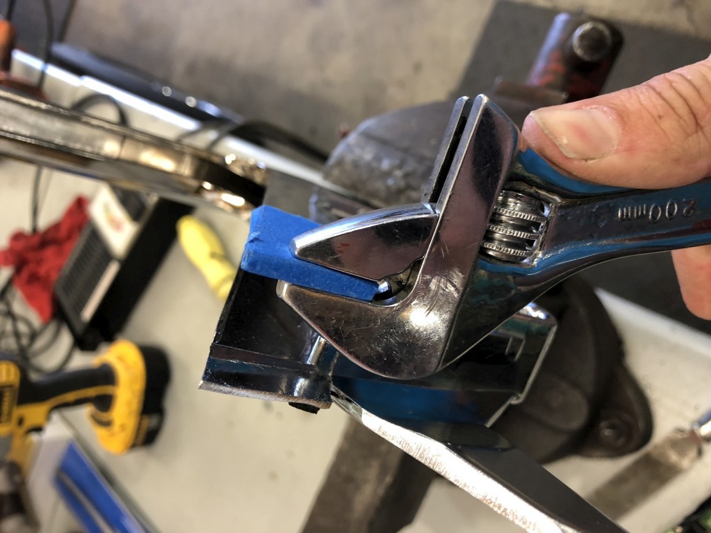So that all seems fine and dandy, right? Well, not quite. Once I tried to put on the vertical division bar, I found that the repro frame piece didn't really line up with it at the bottom (hence the scratches). So in order to get a better fit, I had to carefully twist the lower back ends of the window frame. This was the safest method: