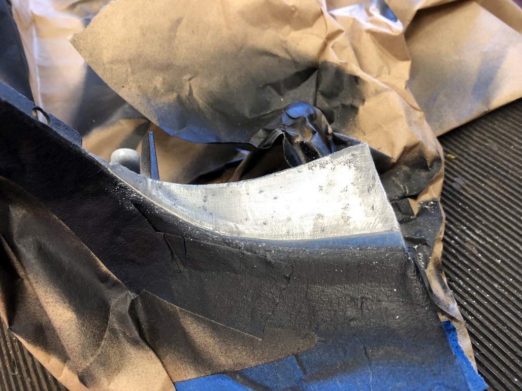 I'll go ahead and save some time and pictures here by saying: the first attempt didn't work out so well. The black paint (SEM Trim Black) reacted with the existing white paint / clear (and yes I scuffed it and used wax & grease remover before spraying). It turned out all crinkly and bubbly. So, out came the acetone, and I was able to pretty easily strip these sections back to bare metal to start over. It worked out perfectly after this. Here's a shot of the other side stripped: