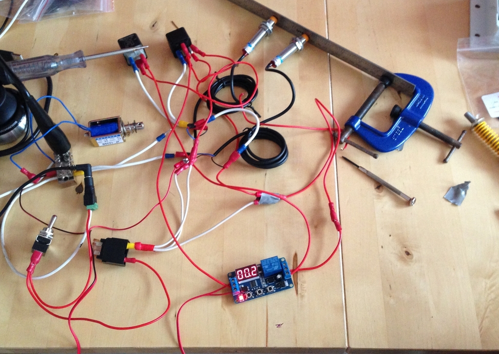 I am using two relays to ensure that, should I catch both pedals accidentally, for a split second, that it will not send power to the solenoid, even though the timer will go through its cycle. The timer now has permanent power to it and uses a signal wire from one of the relays, again both pedals need to be depressed for this to happen.