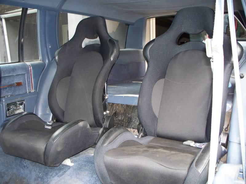 FINALLY!!!!! I have all 4 seats in and mounted. Finally. And I have to say it makes the interior look great. I still need to put new carpet in and fix the headliner as well as other things but the seats and the way they are in the car really look cool. It has a theater style arrangement.