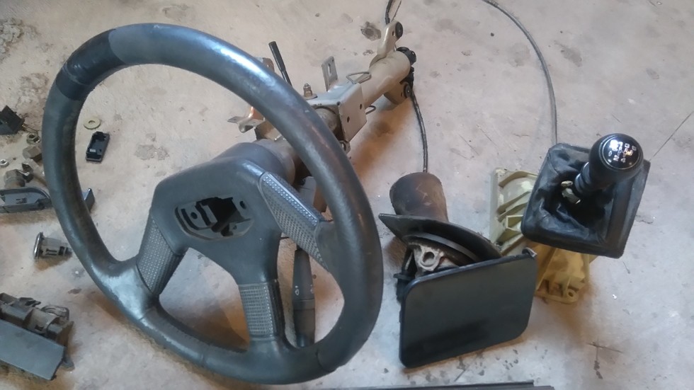 Today the weather was nice so i decided to visit couple car breakers and found recently crash damaged, 405 series 1 probably 91 or 92, it was pretty gone, so i only took the better pieces, took the stering wheel it is lether, unfortunately it has two rips and the center cap is missing, but it can be recovered with new leather, also got the the shifter mehanizam this one has the cable for reverse so if i ever want to do a 6 speed swap i'll have it, also took all the door handles, fuel door, couple of pieces of trim, all in all good trip.