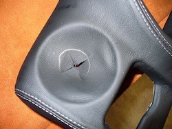 5. Now the vent hole. Cut an X like before, but a tiny bit high center, and smaller. It is best to measure from the vent ridge and the vent to see how far since the vent cant fit over the leather so it will be trimmed to stop right in front of the vent. Put a layer of blue painters tape where the vent will go, then spray some glue on the backside of the leather in the vent hole. Remove the tape and bond the leather. Reason for this is that the glue will prevent the vent from turning like it should when installed.
