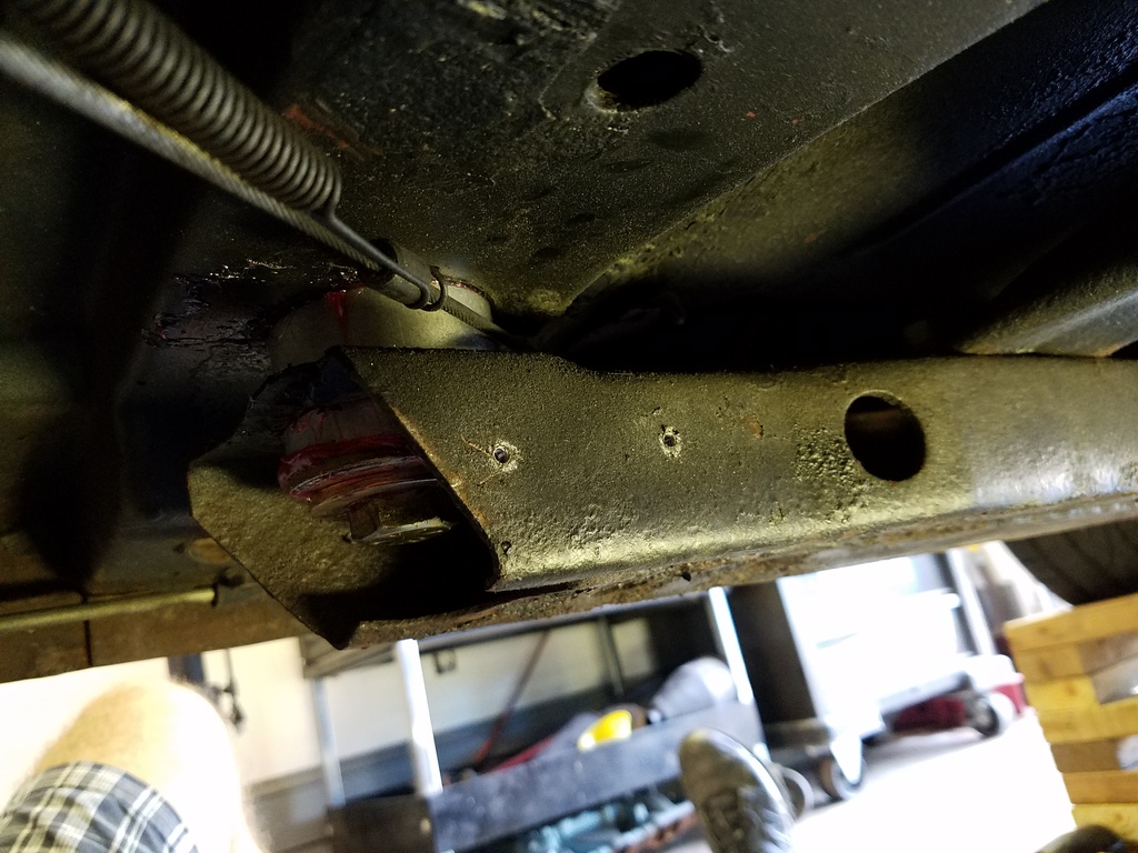 Once you have a connector in position use a grease pencil or piece of chalk to mark all of the holes on the inside and outside of the sub frame and rear frame rail where bolt holes need to be drilled. Lower the frame connector and set aside. I keep a piece of cardboard under the car to put them on so I don't chip, scratch, etc. Next center punch each of the bolt hole marks so you can get a drill bit started without it walking sideways on you. I drill all the holes out with an 1/8" bit before drilling out to a larger size then open them all up to 3/8". You can NOT drill through the rear frame rail to drill the outside holes because the holes in the bracket on the connector don't line up inside/outside exactly. You must drill 4 different holes in the rear frame. Yes, drilling the outside holes is a pain because of limited access in the fender well and spring interference where you need to place the drill. You may have to support the unibody and lower the rear axle to get clearance for a drill by the rear spring as seen in pics below. Once you've got the 4 holes in the rear frame rail put a long 3/8" bit in the drill and run the drill bit all the way through to the corresponding outside hole by the spring. This will make life a lot easier when trying to get the long bolts through later on.