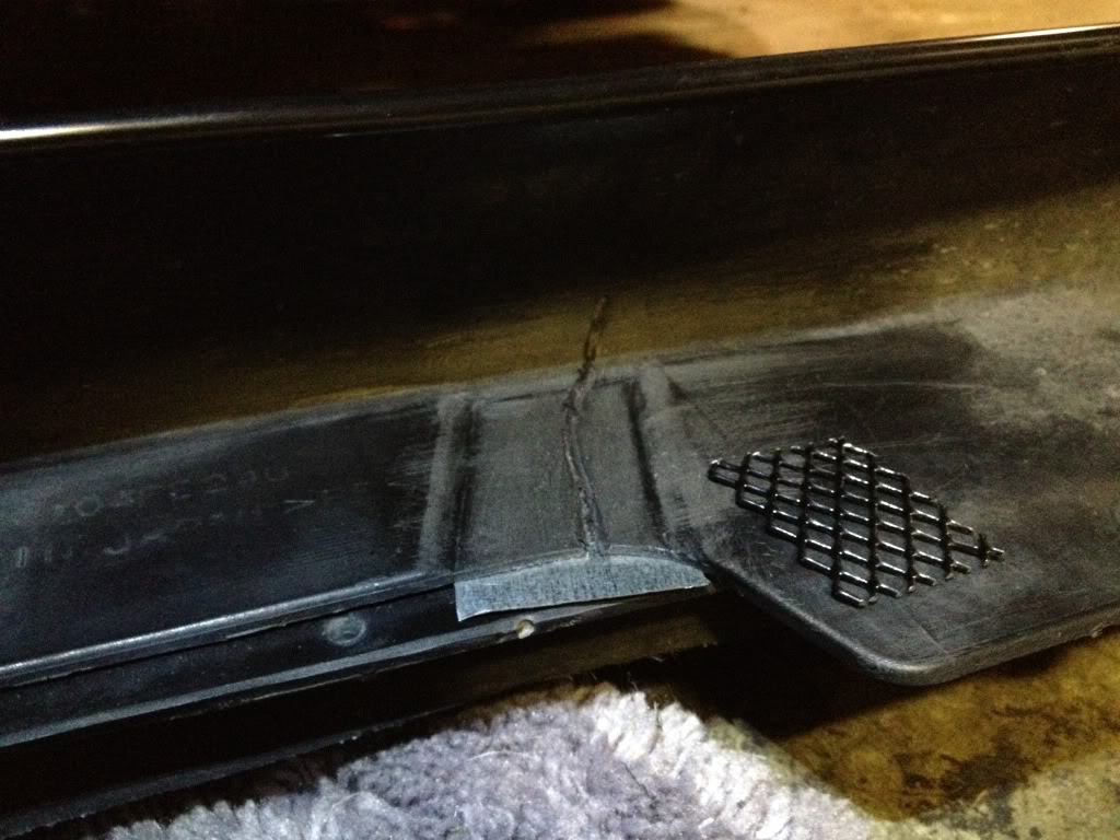 I ground out the sharp edges of the crack itself with a dremel, cut out some gutter mesh for reinforcement, slid a piece of flashing underneath to prevent epoxy from sticking to my front lip and sanded the surrounding area with 120 grit: