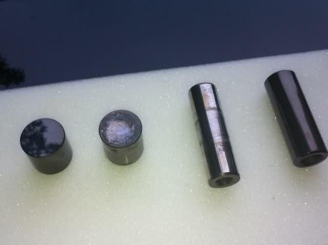 Sent my pistons pins, rings, and valve buckets out to richter Precision in PA to be DLC coated...If you dont know about DLC (Diamond Like Coating) google it....greatly reduces friction between metal, hard as hell, a lot of Formula race car builders use it on their parts....not mainstream yet because of cost but car companies like Nissan are utilizing it in their engines now for longer life. if you have a little extra money i recommend it, friction robs engines of HP...so in the quest to have the highest output of your build every little detail must be taken into account. Picture below is stock used bucket and pins and DLC coated next to them...