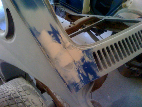 If you recall from previous pictures there were some rust holes on the bottom section of the body behind the crescent moon vent. That's been taken car of. I've finished the drivers side rust holes but here's a pic of some layering of body filler smoothing out the holes.