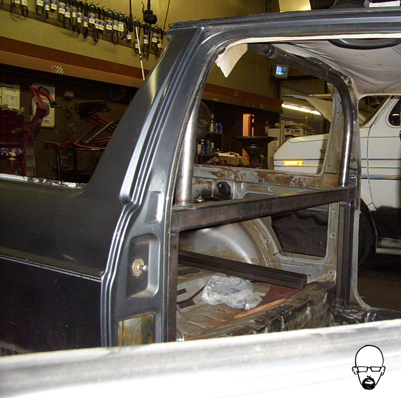 Removed those horrible L brackets that I welded in and went with square tubing. Fab-Master J made a nice roll type bar and some supports. As you can see it is coming alone very nicely. Soon we will be able to actually enclose the Rear portion of the Truck.