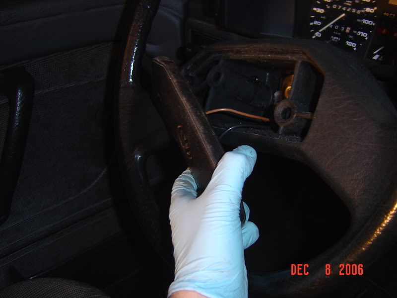 Slide off the trun signal stalk/control module and unlug that white plug in the process.