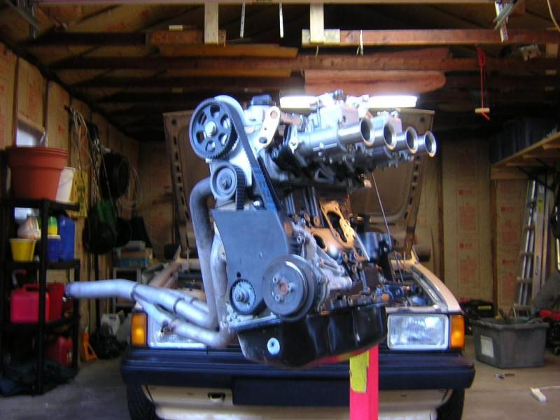 From the very start I knew I wanted some sort of carb setup. Soon I had decided on a 16v and began tracking down the necissary parts. Original plans spiraled out of control until I had planned such an all out race motor that it would be undriveable and most of all compltely out of my price range. I eventually decided I wanted something that was fun, yet reliable and would be useable both on the track and cruising around town. I had a 1.8L 16v that was in need of a rebuild. I priced what it would cost to get it up to snuff with some slight performance tweaking. Then I discovered that for less than the parts alone would cost I could have a brand new, factory relliable, 2.0L ABF 16v long block. For those who don't know the ABF is the last evolution of the 16v installed in european mk3's. There are many minor differences from the US spec PL and 9A but basically it's a taller ABA style block with a better flowing head. They were factory rated at 150 bhp. Apparently VW actually tweaked the power down to 150 via the ECU so as to not compete with the VR6. People have been able to get 170+hp out of them with some simple, bolt on modifiactions.
