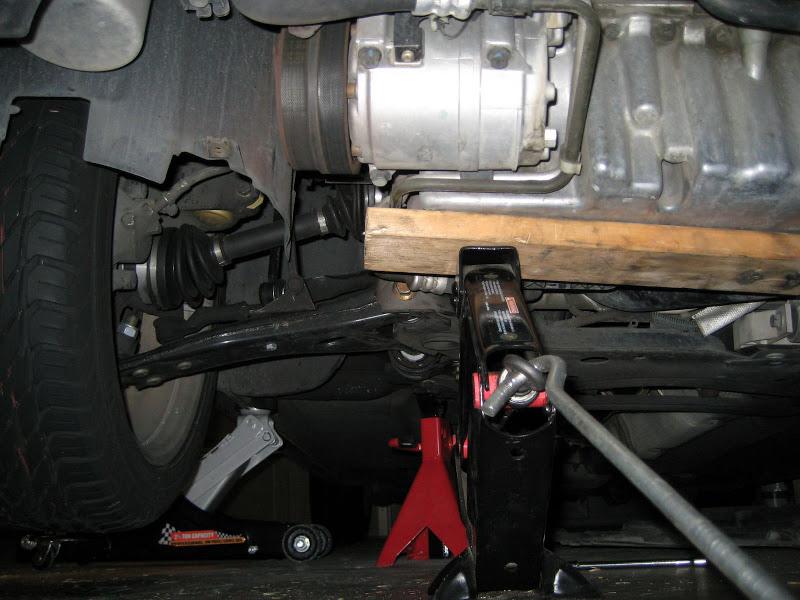 4) Use a piece of wood and the second jack, jack up the engine a little bit